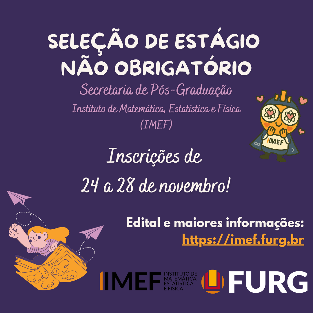 O Instituto de Matemática, Estatística e Física - IMEF da Universidade Federal do Rio Grande - FURG, no uso de suas atribuições, torna pública a abertura de inscrições para vaga de estágio remunerado não obrigatório, para atuar junto à Secretaria de Pós-Graduação.